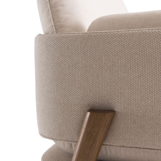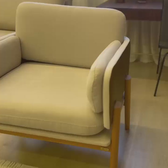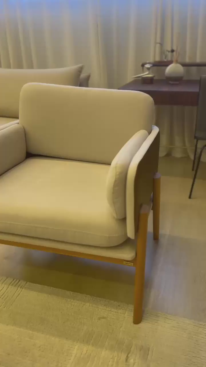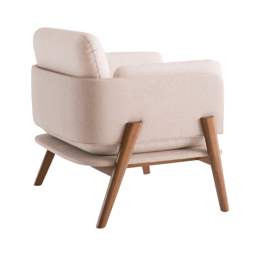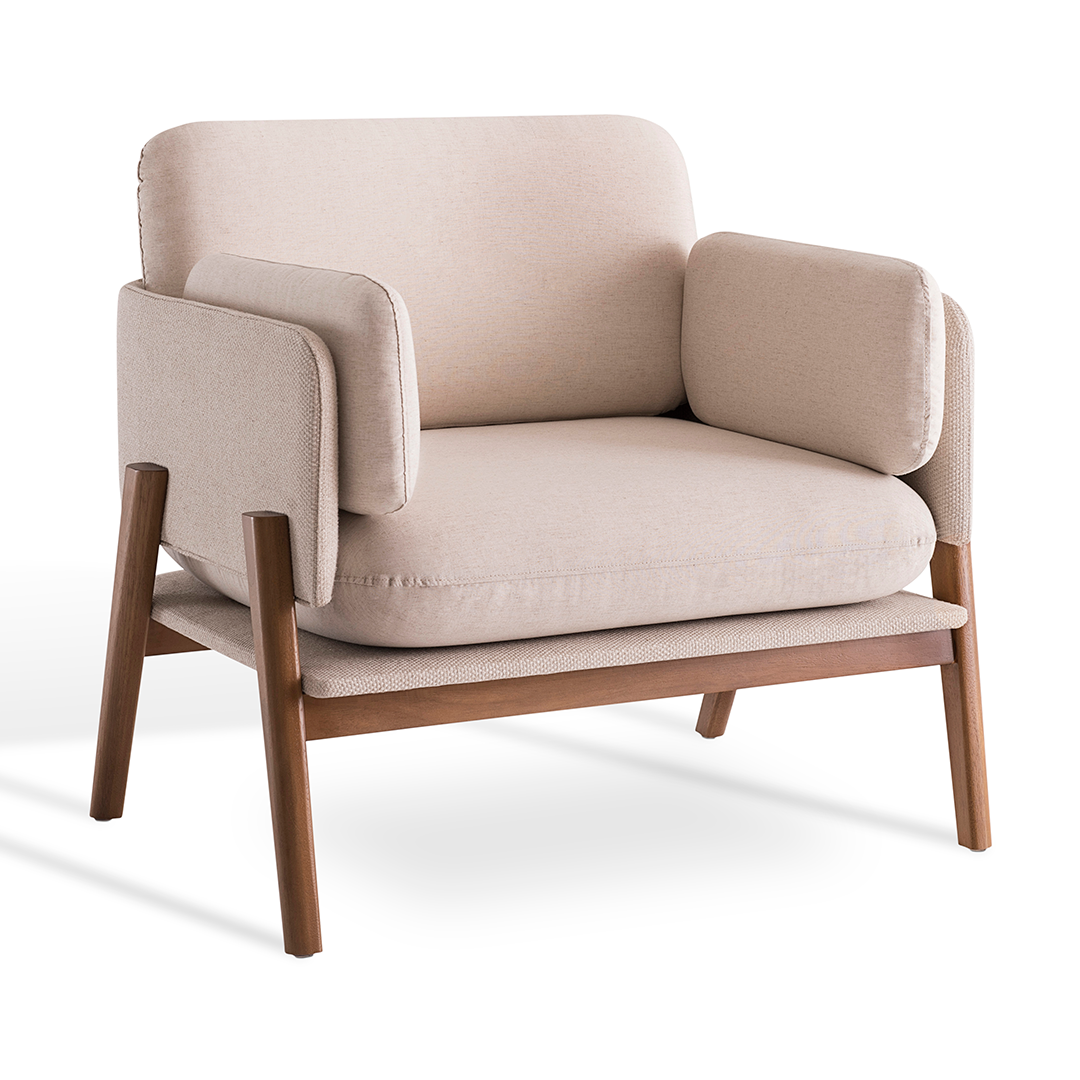 Sua estrutura de assento e encosto é construída em multilaminado, garantindo durabilidade e um desenho elegante e curvo. O conforto é proporcionado pelo acolhimento em espuma D-28 e manta de fibra, oferecendo suporte ideal para leitura ou descanso.