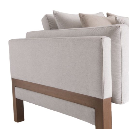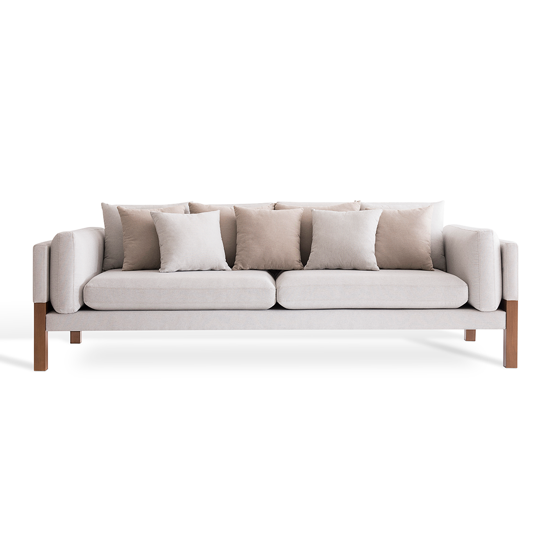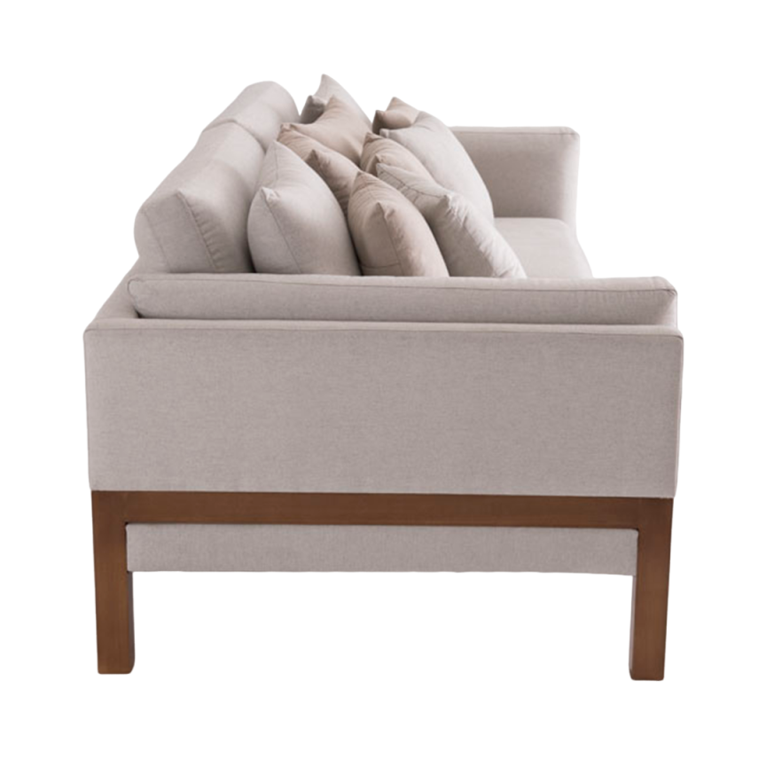 O braço fixo possui uma almofada solta com espuma D-23 e manta de fibra, garantindo versatilidade. As almofadas decorativas soltas, preenchidas com fibra de silicone, finalizam o toque de maciez. A estabilidade é garantida pela estrutura em eucalipto maciço e pelos elegantes pés em madeira maciça.