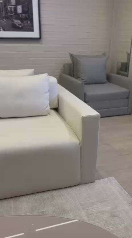 O assento fixo com percinta elástica, espuma Soft D-28 e manta de hiper soft oferece um acolhimento superior e prolongado. O encosto (Espuma Soft D-28 e manta de fibra) e os braços (Espuma D-33) garantem a ergonomia e o suporte ideal. As almofadas decorativas soltas, preenchidas com fibra de silicone, adicionam a maciez final.